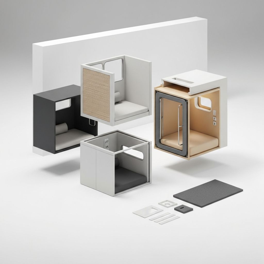 Prefabricated compact rooms for solo travelers and couples, designed for flexible footprints.