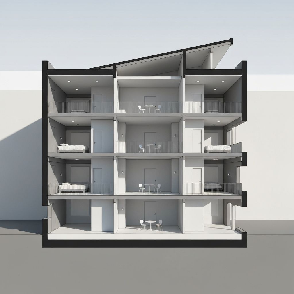 Modular architectural components: dorm pods, private rooms, bathroom cores, reception units, and common areas. All designed to maximize space efficiency and guest experience.